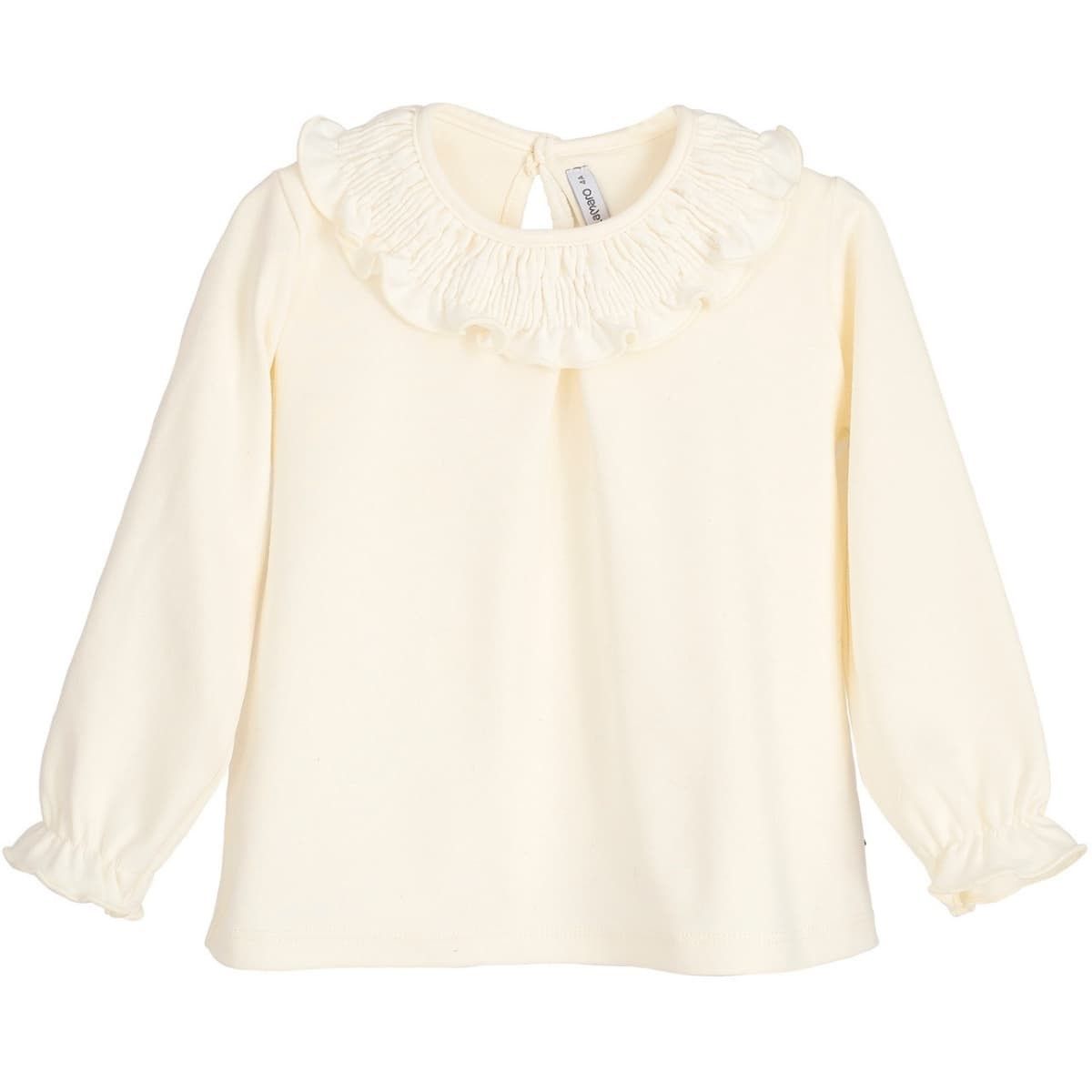 Cuello con volante fruncido, que aporta un aire romántico y delicado.