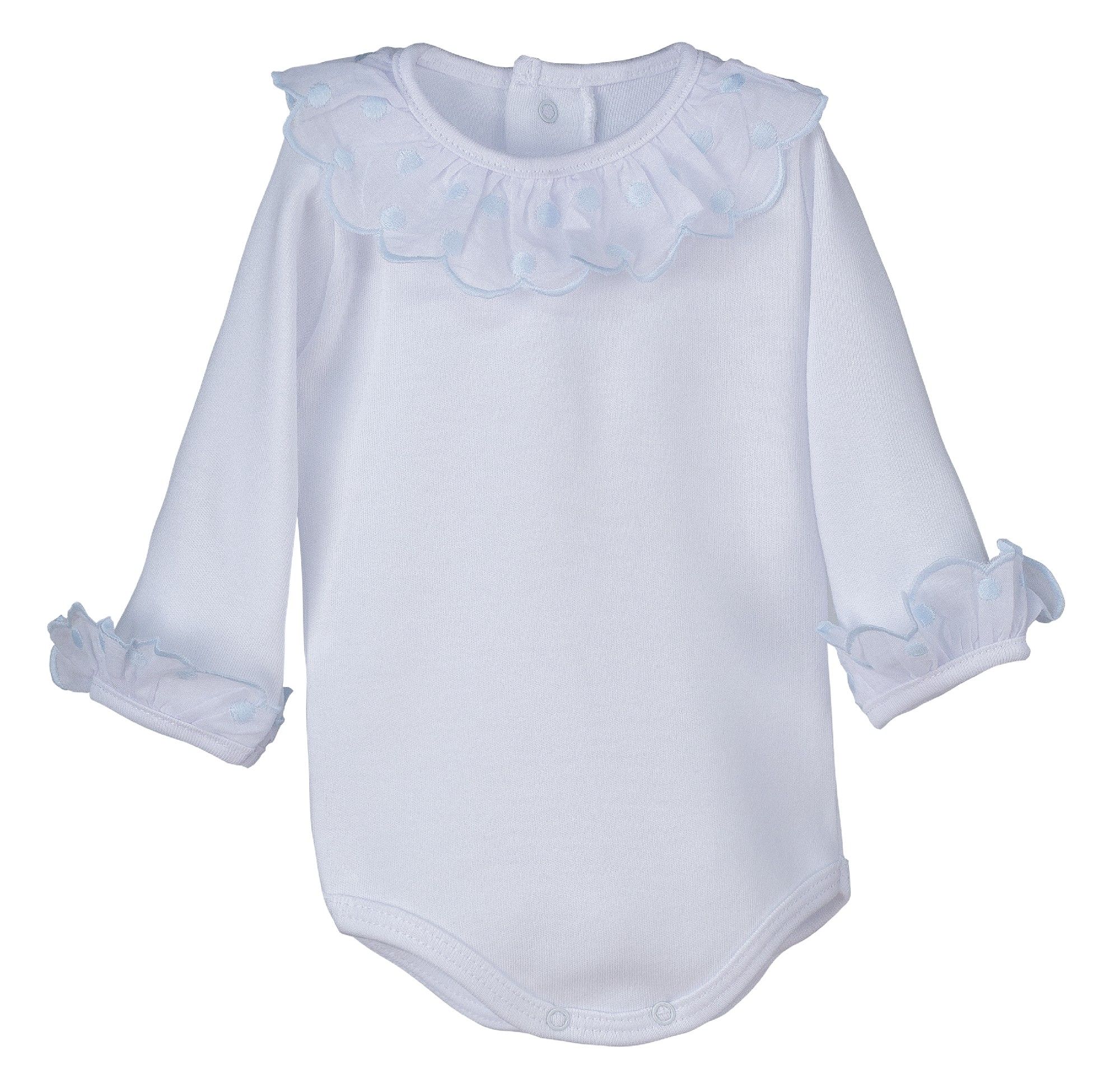 Encantador body de bebé en color blanco con cuello volante de tul bordado en tono celeste, una prenda delicada y elegante para los looks más especiales del bebé 👶💙.