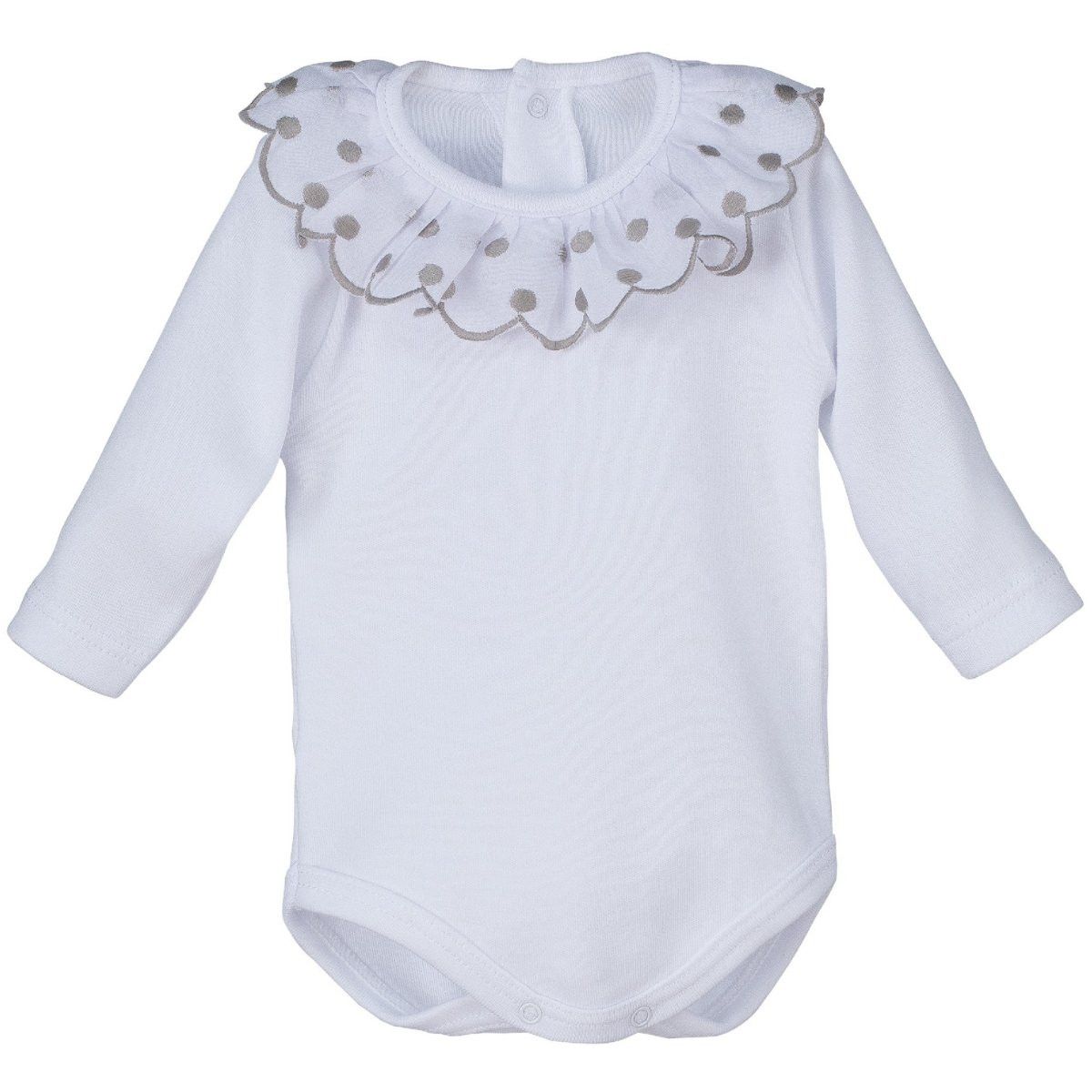 Un body clásico con un toque delicado y elegante. Este modelo en color blanco incorpora un precioso cuello bordado con acabado ondulado y detalles en gris, que aportan contraste y sofisticación sin perder dulzura.