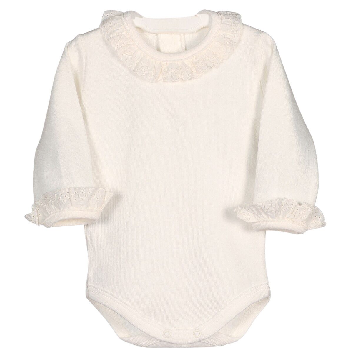 Este precioso body de manga larga es una prenda básica pero con un toque muy especial gracias a sus delicados volantes bordados en cuello y puños, que aportan elegancia y dulzura a cualquier conjunto.