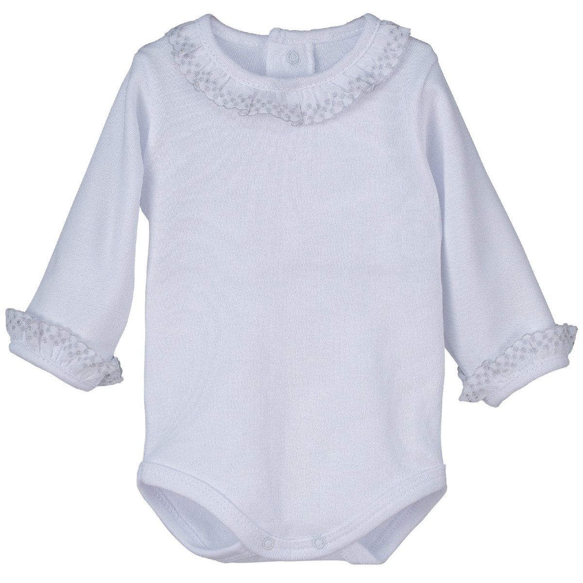 Este body de manga larga es el complemento perfecto para los looks más dulces y elegantes de tu bebé. Su diseño clásico en color blanco se embellece con delicados volantes bordados en tono gris en el cuello y los puños, aportando un estilo fino y muy combinable.