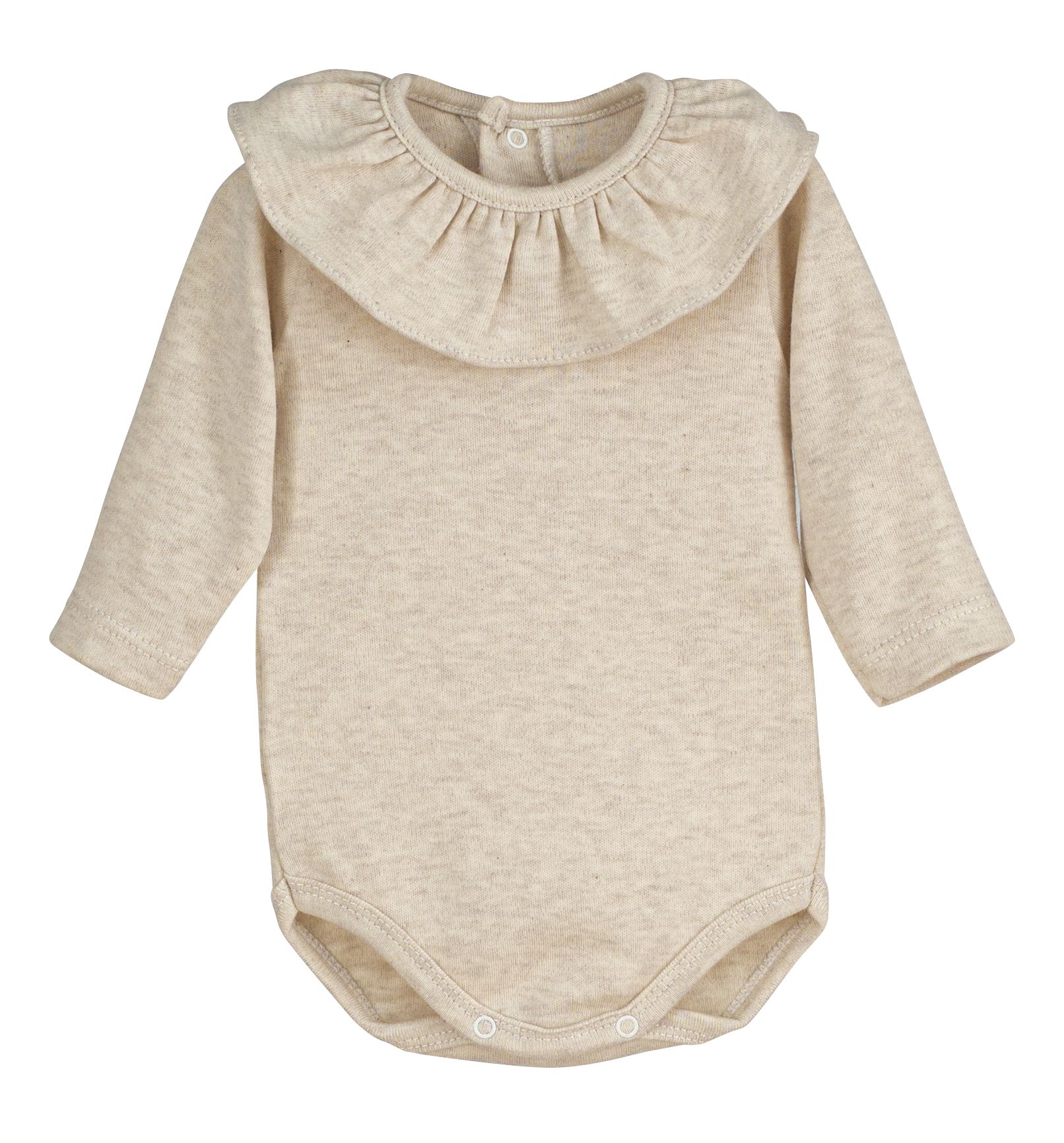 Delicado y combinable body de bebé en tono beige jaspeado con cuello volante, perfecto para crear looks dulces y atemporales 👶✨.