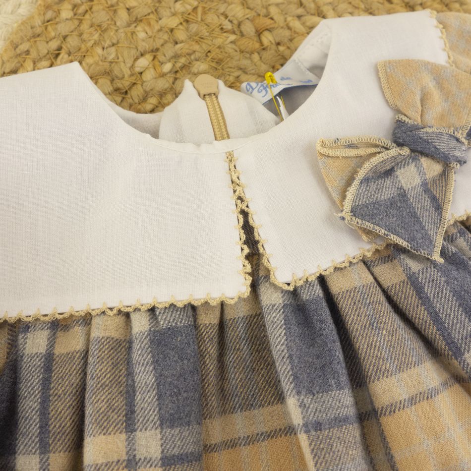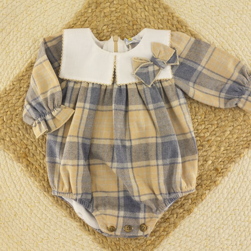 💛 Pelele bebé cuadros beige y azul con cuello blanco 💙✨