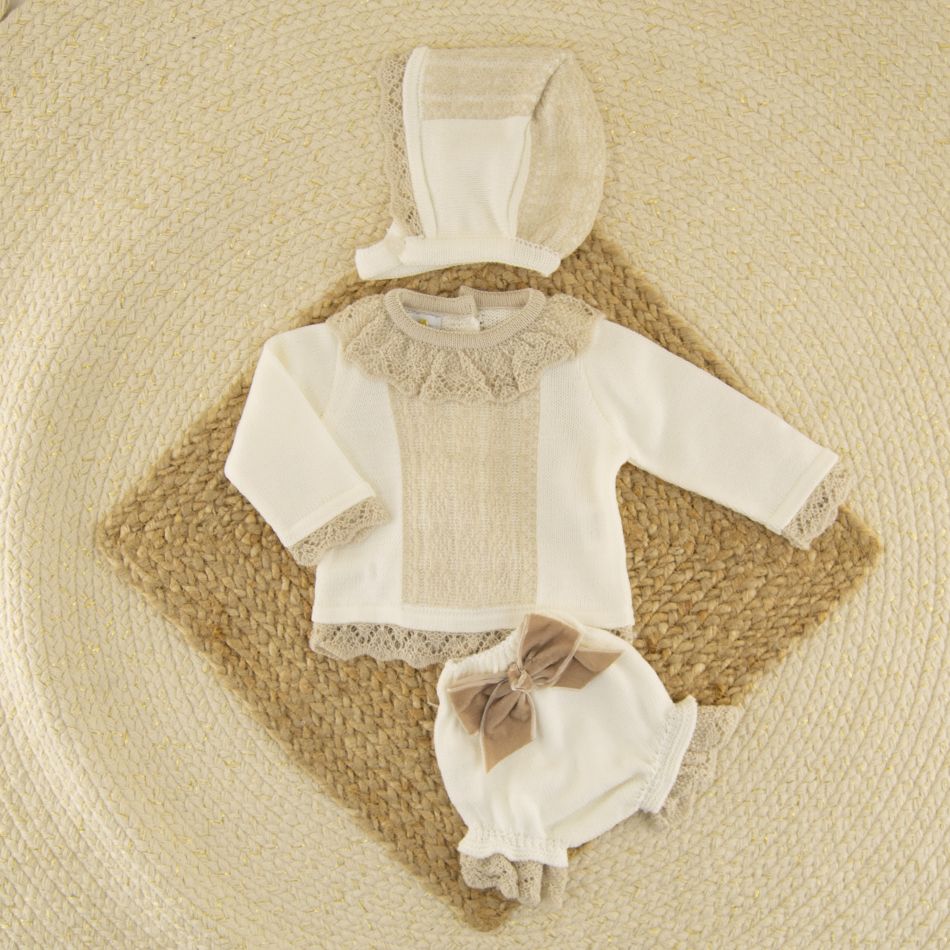 Nuestro conjunto presenta un cubrepañal suave y delicado, confeccionada con lana de alta calidad que acaricia la piel del bebé con suavidad.