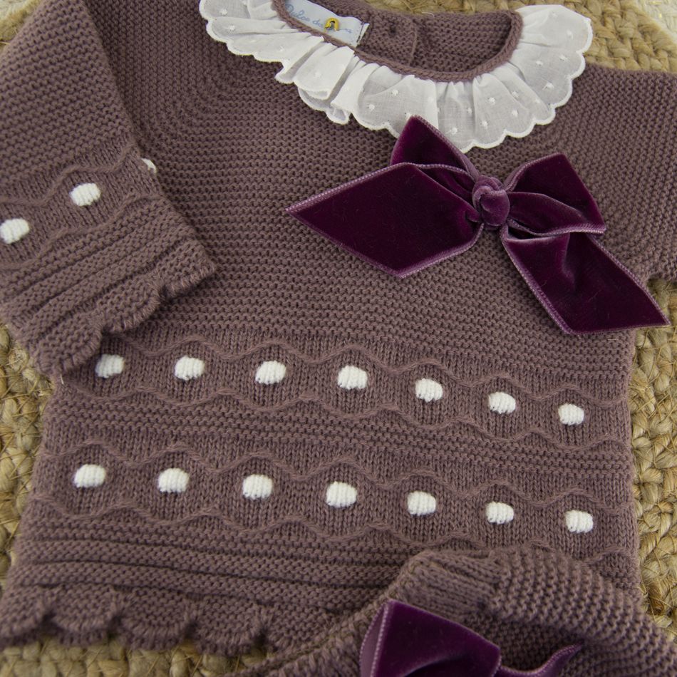 Elaborado en punto suave, este conjunto incluye jersey, cubrepañal y capota a juego, ideal para vestir a tu peque en ocasiones especiales o en el día a día con un toque elegante.