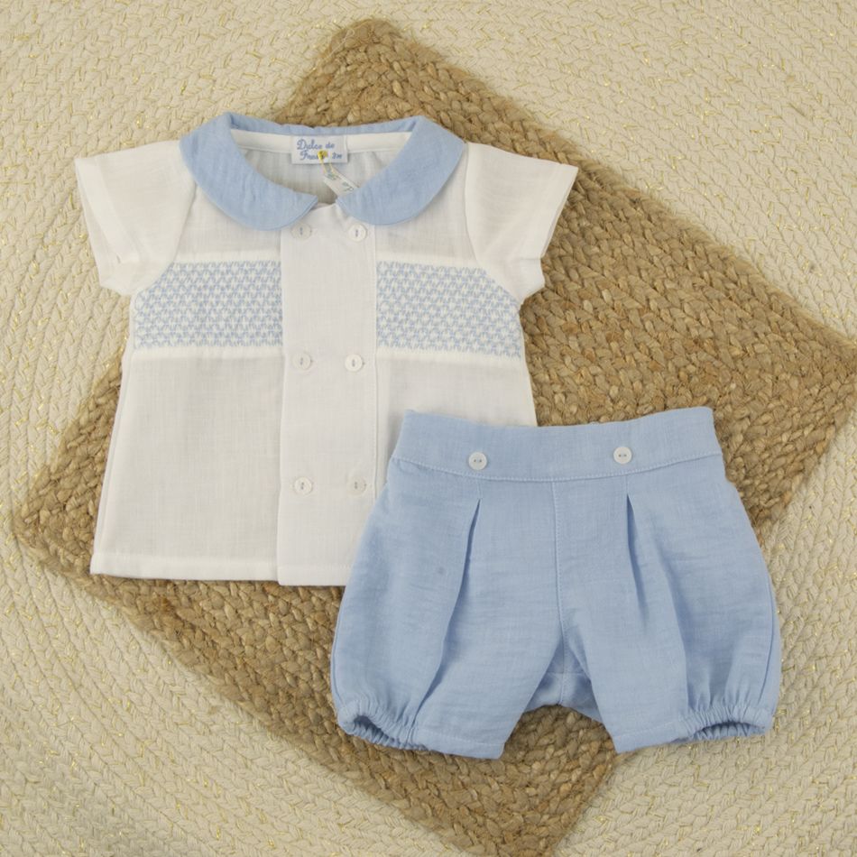 Conjunto lino azul bebé niño ceremonia para verano elegante