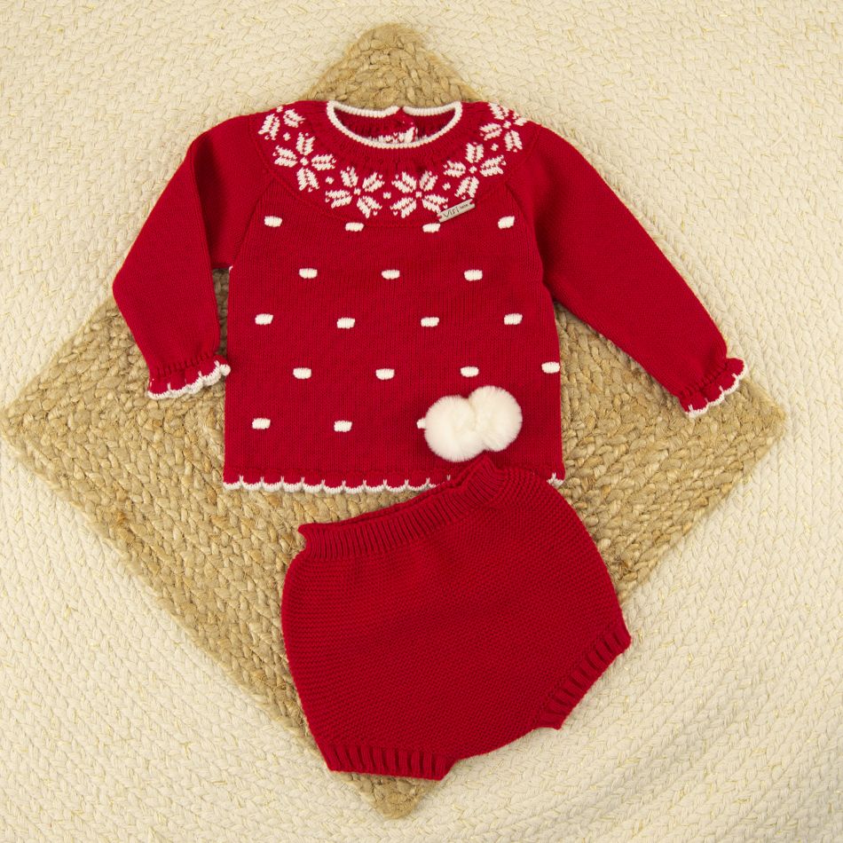 El jersey luce un precioso bordado de copos de nieve en blanco, con pequeños detalles de puntitos tejidos y un adorable pompón doble en la parte baja. Los acabados en el cuello, puños y bajo están rematados con un delicado borde blanco que realza su diseño.