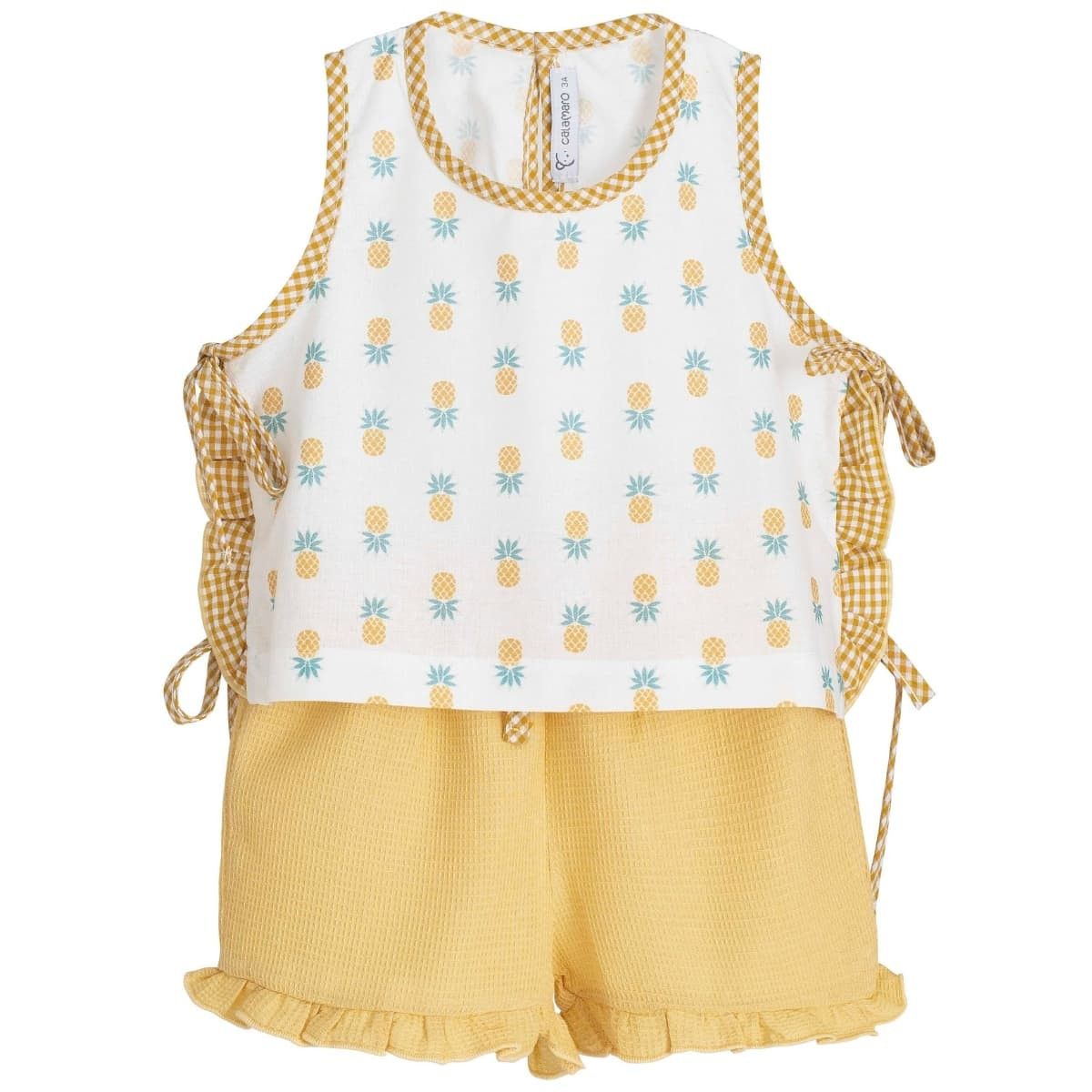 El verano es una época llena de luz, color y momentos especiales en familia. Este conjunto niña piñas verano de la colección Gaya de Calamaro transmite perfectamente esa alegría estival a través de un diseño fresco, luminoso y lleno de detalles encantadores.