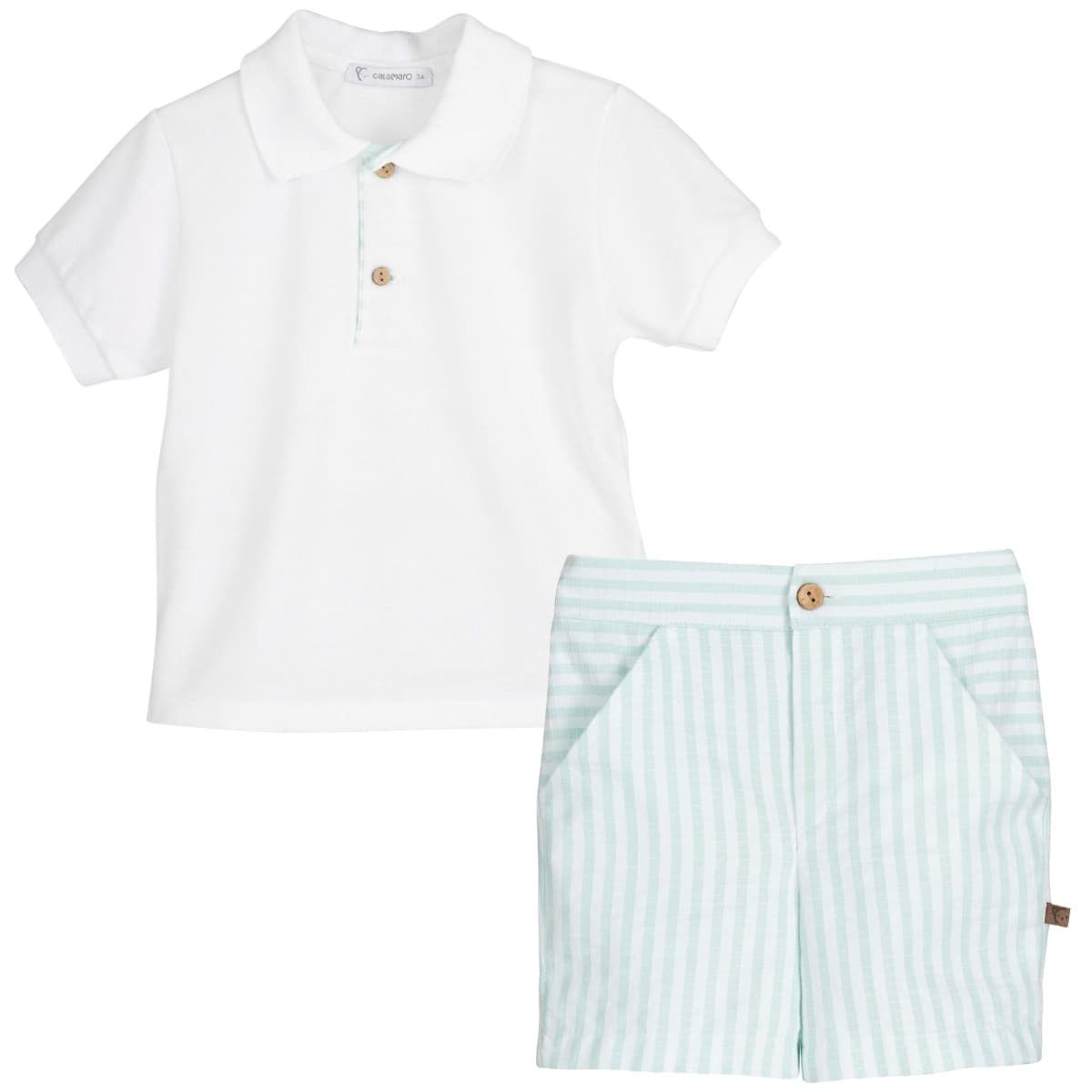 Conjunto de bebé dos piezas formado por polo blanco y bermuda de rayas verde agua, perfecto para un look veraniego, fresco y elegante ?.