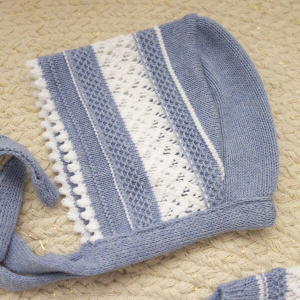 Está formado por jersey, capota, cubrepañal y patucos confeccionado con algodón de alta calidad que acaricia la piel del bebé con suavidad.