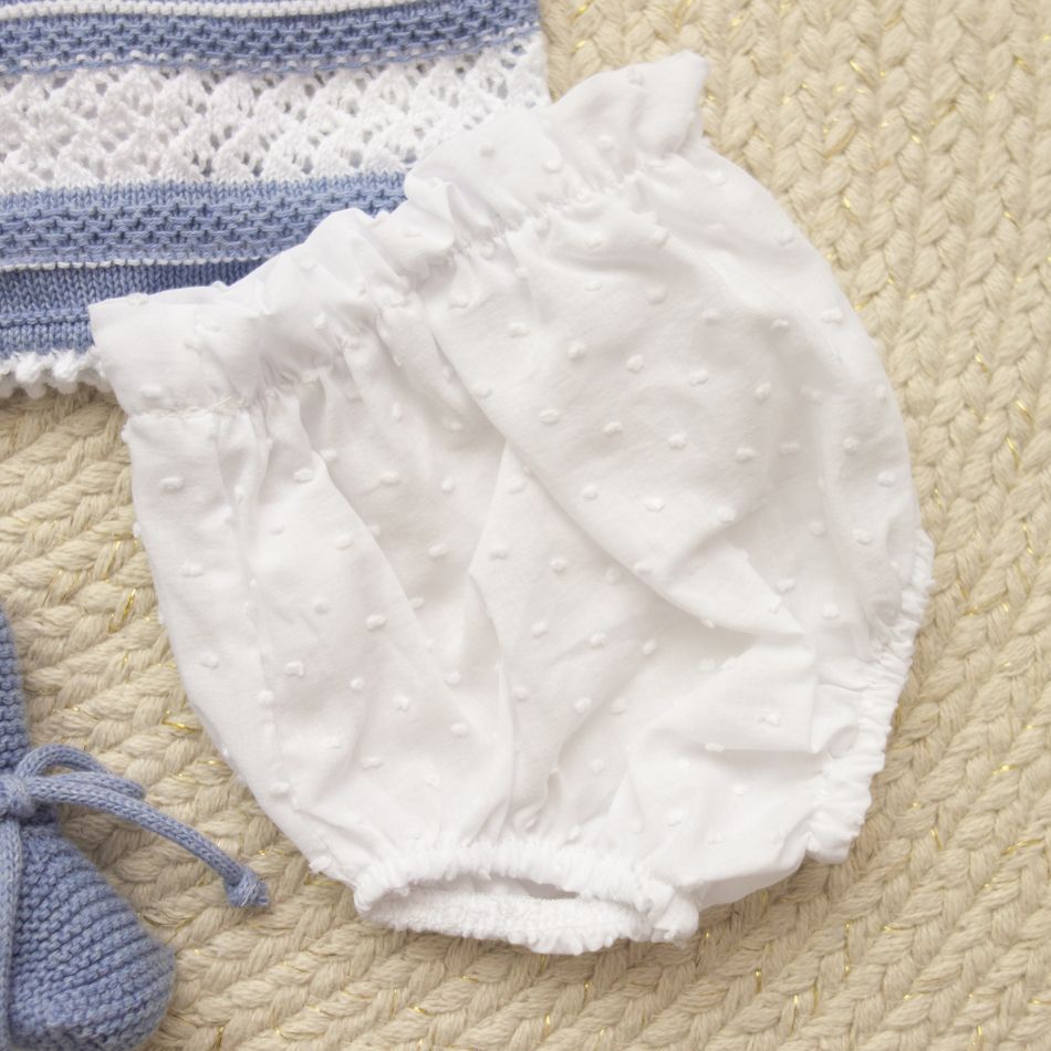 Diseño con garbancitos en el jersey y el cubrepañal es de tela plumeti en crudo.