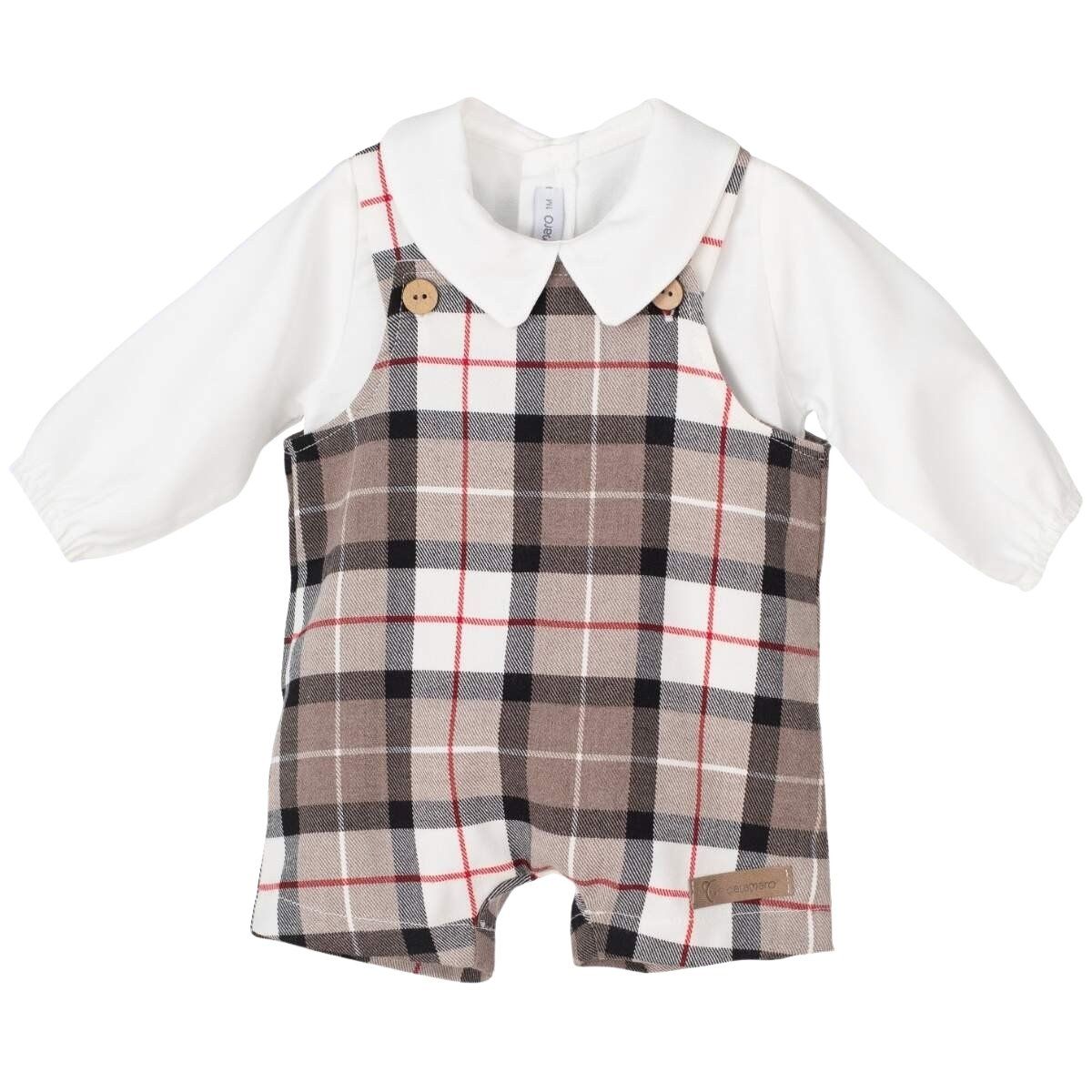 Clásico y encantador pelele para bebé niño, confeccionado en tejido de cuadros en tonos beige, marrón y rojo, con una dulce camisa blanca incorporada. Un conjunto perfecto para los meses más frescos, que combina elegancia, comodidad y calidez.
