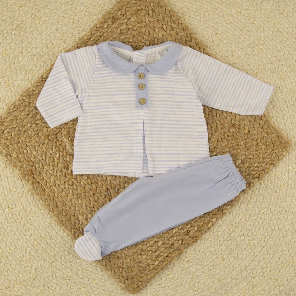 La parte superior está confeccionada en tejido suave con rayas finas azul cielo, adornada con un cuello bebé redondo y tres botones efecto madera en la parte frontal. Incluye un pequeño pliegue central para un ajuste cómodo y elegante.