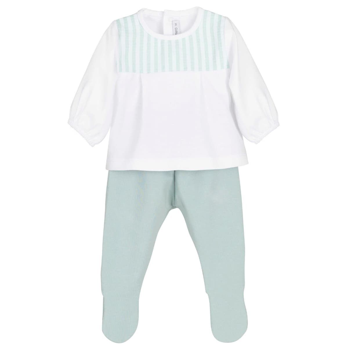 Incluye camiseta de manga larga en tono blanco con detalle de rayitas en verde agua y polaina con pies a juego, perfecta para mantener al bebé abrigado sin necesidad de calcetines.