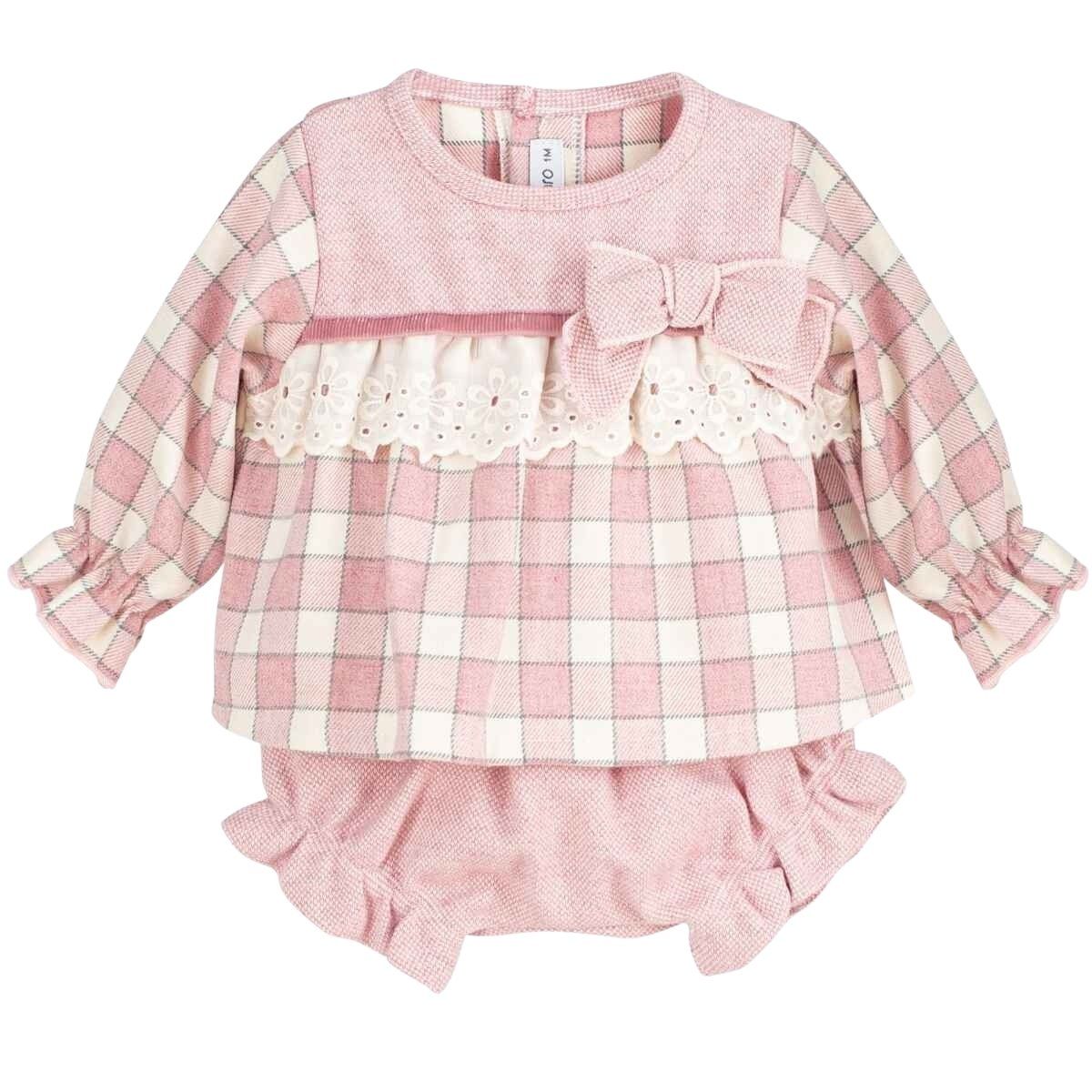 Dulce y encantador conjunto para bebé niña, compuesto por blusa de cuadros en tonos rosa y blanco con braguita a juego. Una prenda ideal para los días frescos, que combina estilo clásico con el máximo confort.