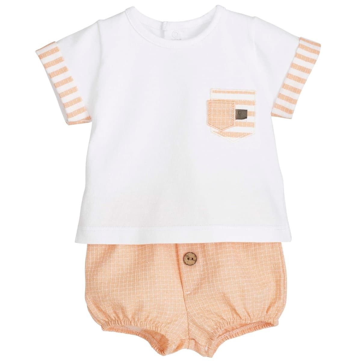 Conjunto para bebé compuesto por camiseta blanca y pololo en tono melocotón, un look dulce y fresco para los días de primavera y verano ?.