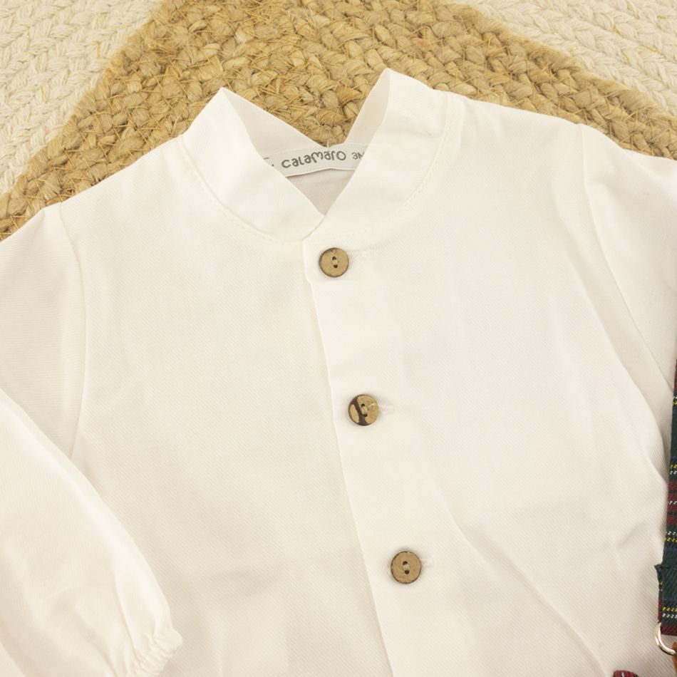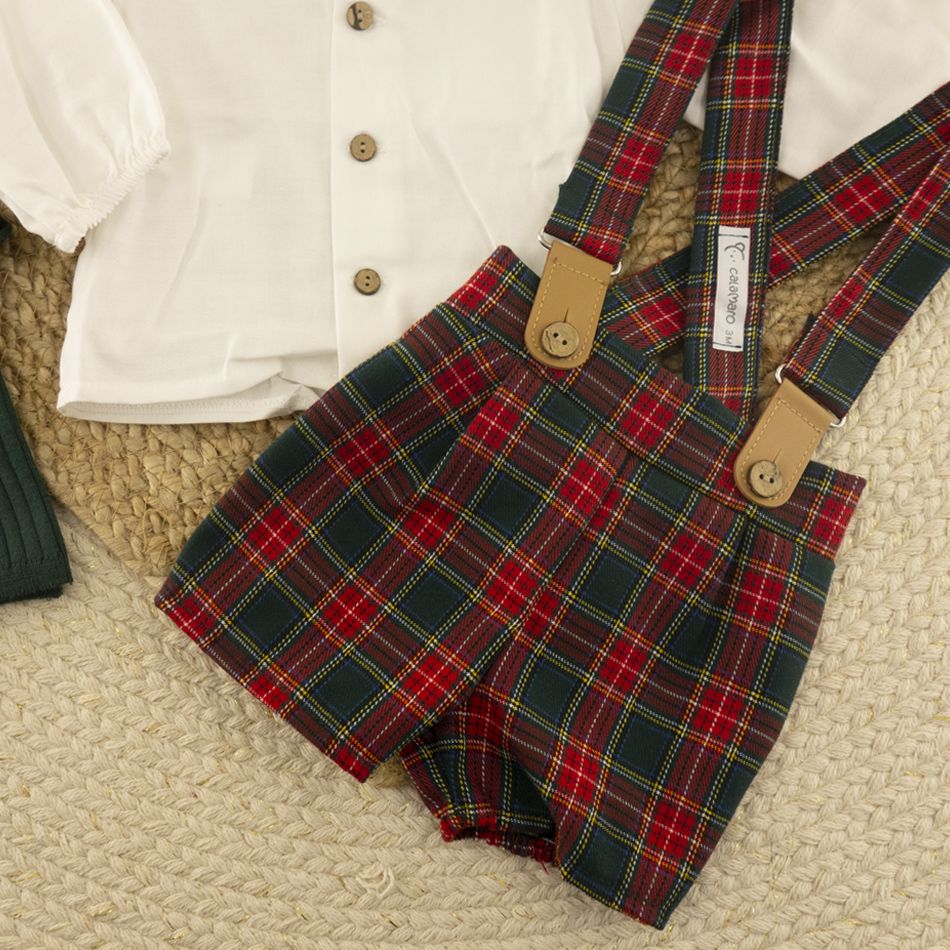 Compuesto por una camisa blanca de manga larga y un pantalón corto de cuadros escoceses con tirantes, es ideal para lucir en celebraciones, Navidad o cualquier ocasión especial.