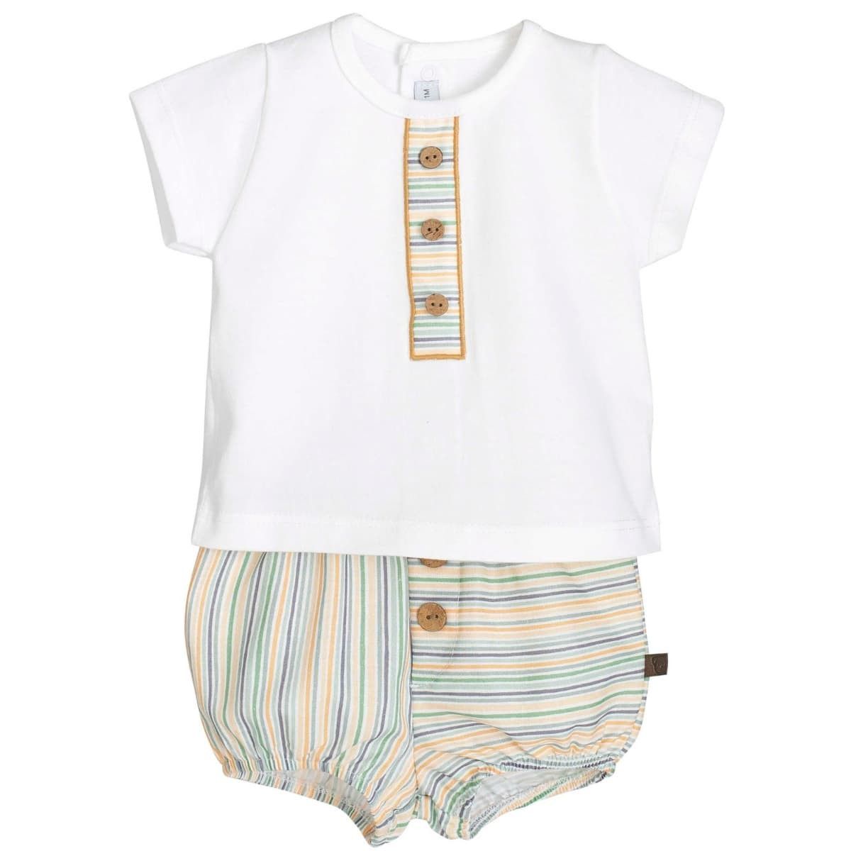 La camiseta blanca destaca por su tapeta central con detalle en tejido de rayas y botones efecto madera 🤍🪵. Se combina con pololo de rayas multicolor suaves 🌈 en tonos verdes, mostaza y azul, creando un conjunto armonioso y muy dulce.