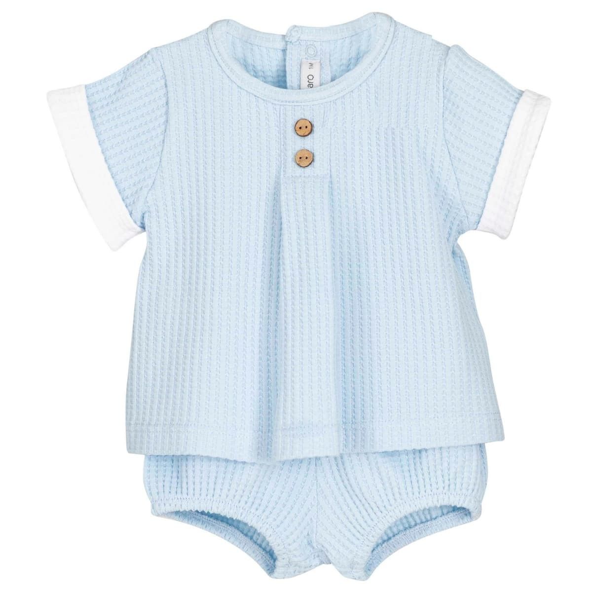 Incluye una camiseta de manga corta con botones de madera decorativos y una ranita a juego, ambos confeccionados en suave tejido waffle.