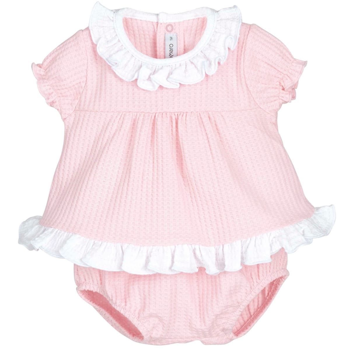 Este adorable conjunto de dos piezas combina una blusita de textura waffle con cuello y bajo de volantes, y una ranita a juego.
