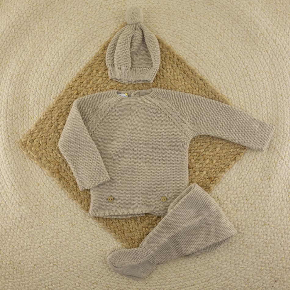 Está formado por jersey, capota y polaina confeccionada con lana de alta calidad que acaricia la piel del bebé con suavidad.