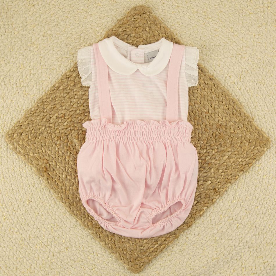 Un conjuntito encantador y lleno de dulzura, perfecto para los días especiales y también para el diario. Está compuesto por una ranita rosa con tirantes y una blusita a rayitas en blanco y rosa de manga corta con volantes, que aporta un toque delicado y muy coqueto.
