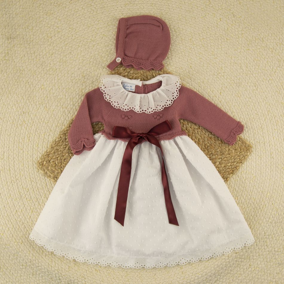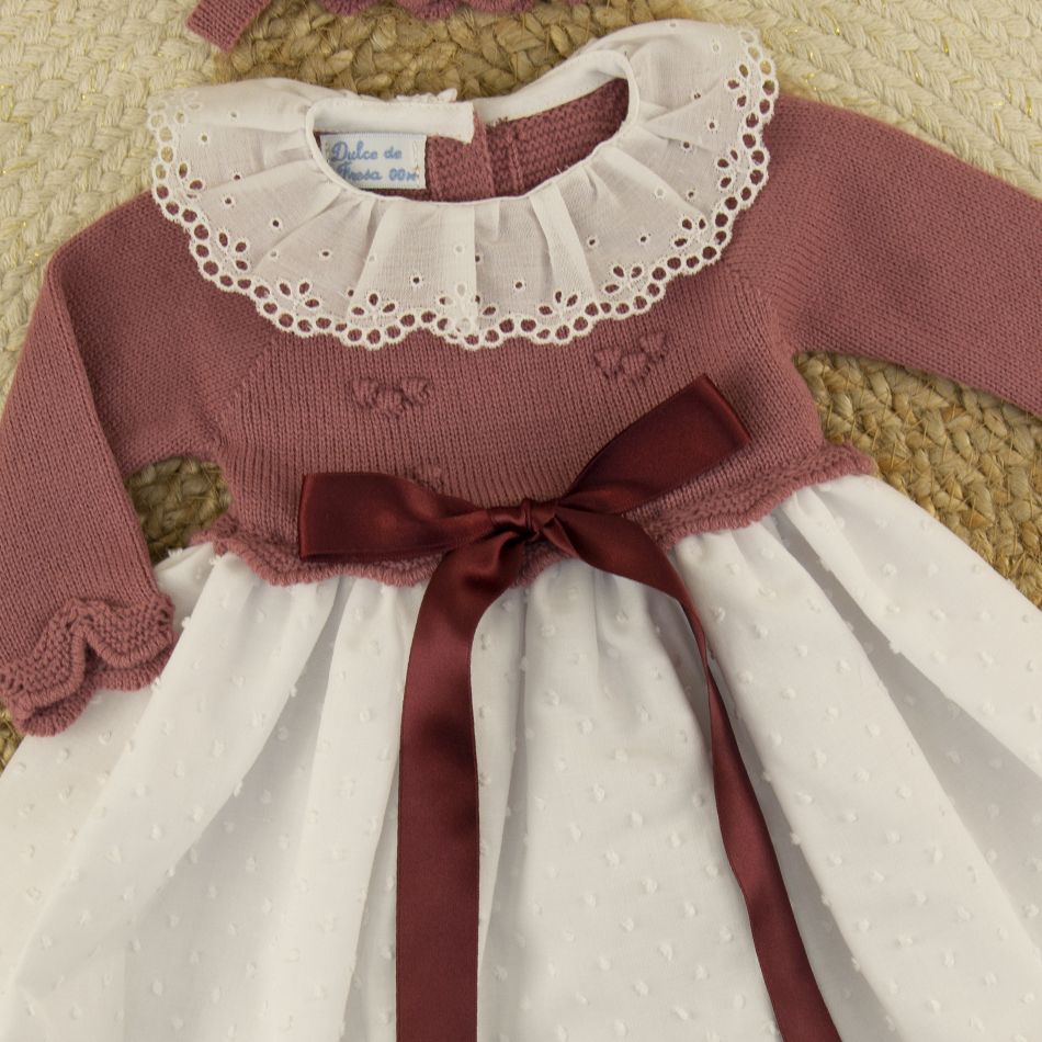 La parte superior, confeccionada en punto burdeos, presenta delicados calados decorativos y un encantador cuello de batista bordado en blanco con detalle de ondas.