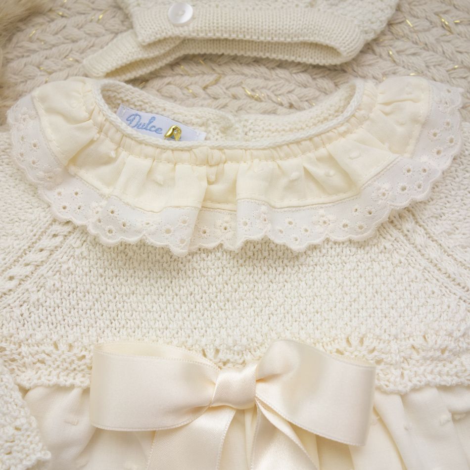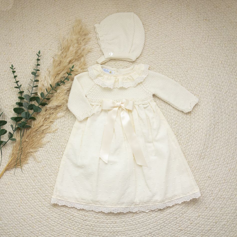 El faldón presenta una parte superior en punto fino con cuello de volante en batista bordada y un lazo de raso crudo al centro, aportando un toque de ternura.
