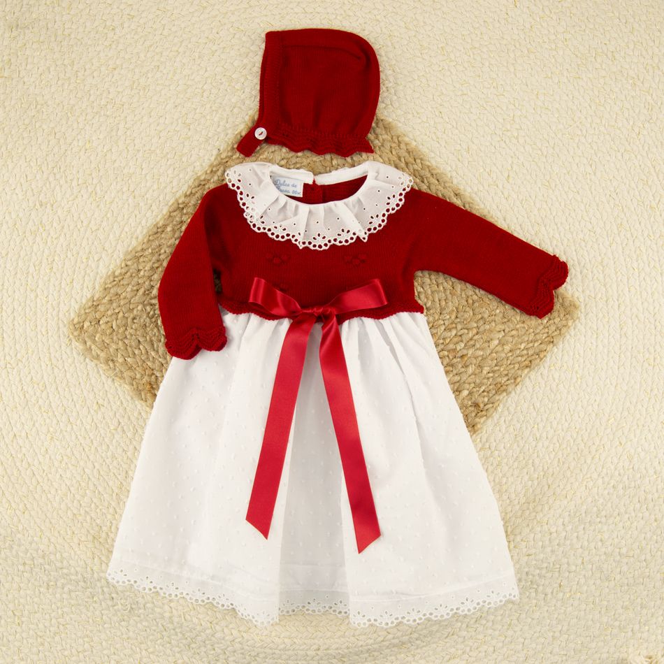 La parte superior, confeccionada en punto rojo suave y cálido, presenta delicados calados decorativos y un precioso cuello de batista bordado con ondas.