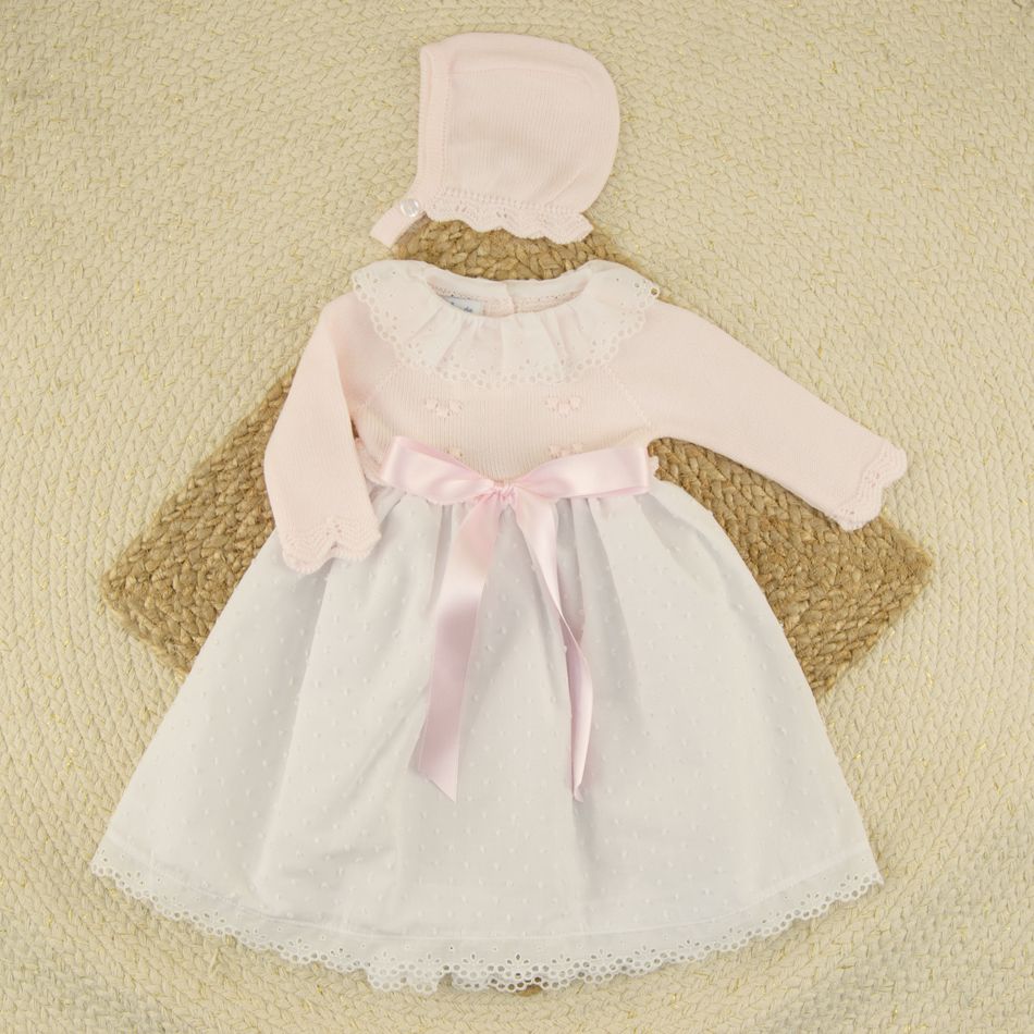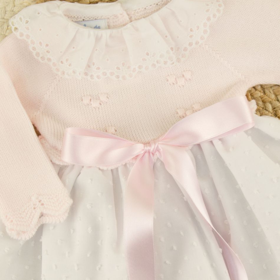 La parte superior, confeccionada en punto rosa suave y cálido, presenta delicados calados decorativos y un precioso cuello de batista bordado con ondas.
