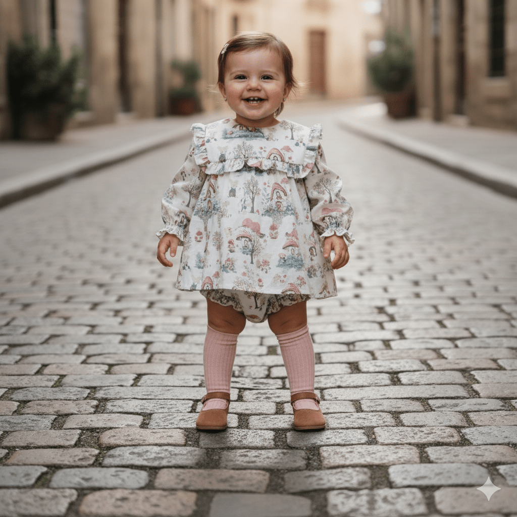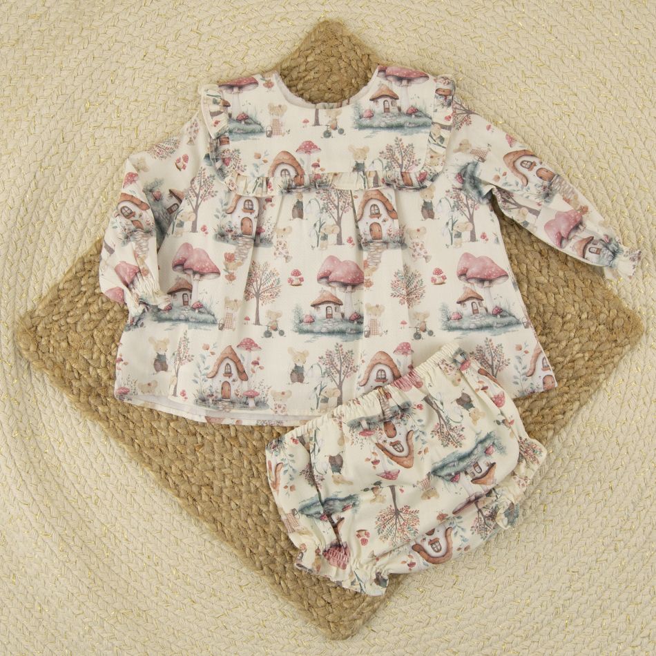 Su tejido suave y delicado está estampado con un encantador diseño de casitas, árboles, animalitos y detalles del bosque, creando un look tierno y lleno de fantasía.