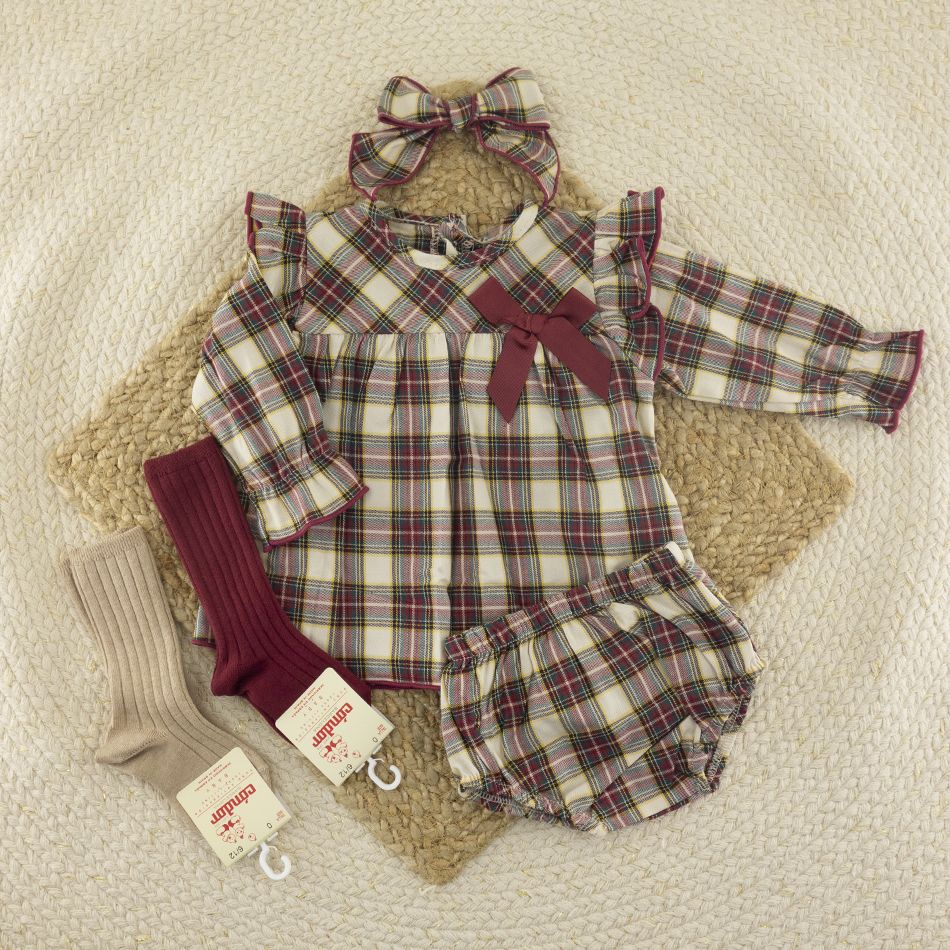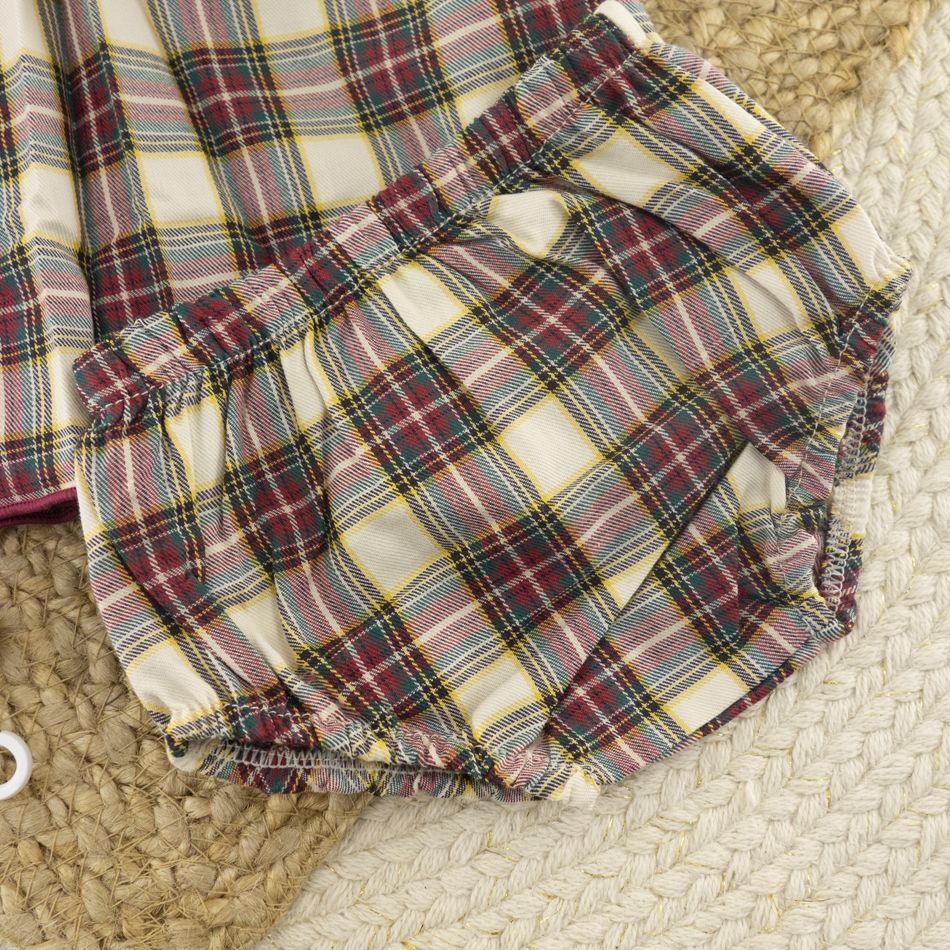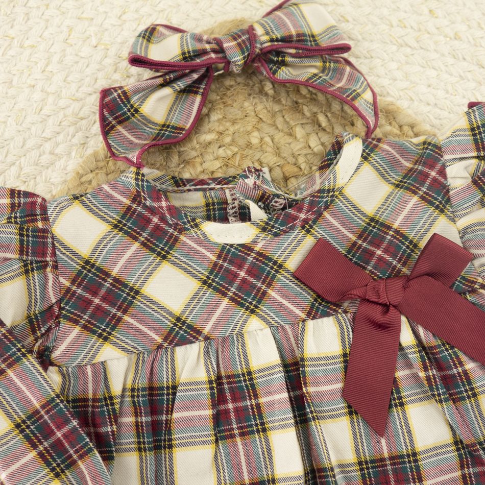 Este jesusito con estampado de cuadros en tonos burdeos, verde y mostaza destaca por su estilo atemporal y su delicado lazo decorativo, ideal para las ocasiones más especiales del otoño e invierno 🍁.