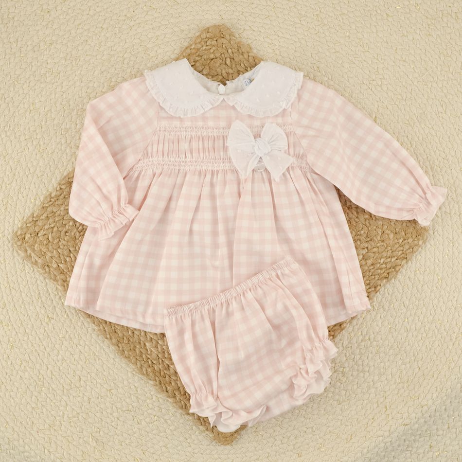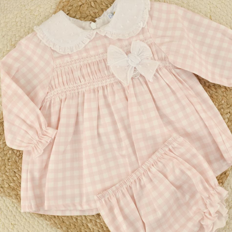 Dulzura y elegancia se unen en este precioso jesusito para bebé niña, confeccionado en un suave tejido de cuadros vichy rosa y blanco.