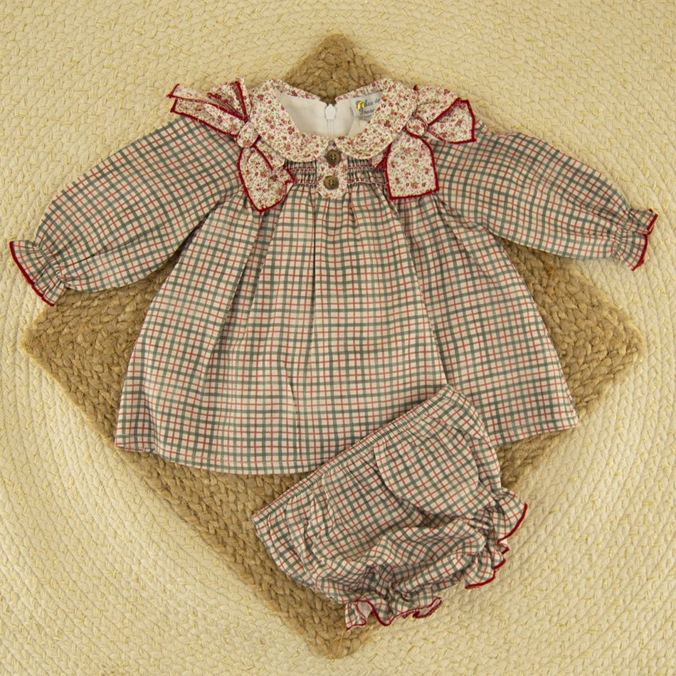 🎀 Conjunto de bebé de cuadros en tonos verde, crudo y rojo, compuesto por blusa de manga larga y braguita a juego. Un diseño con encanto tradicional que combina el aire campestre con un toque romántico.