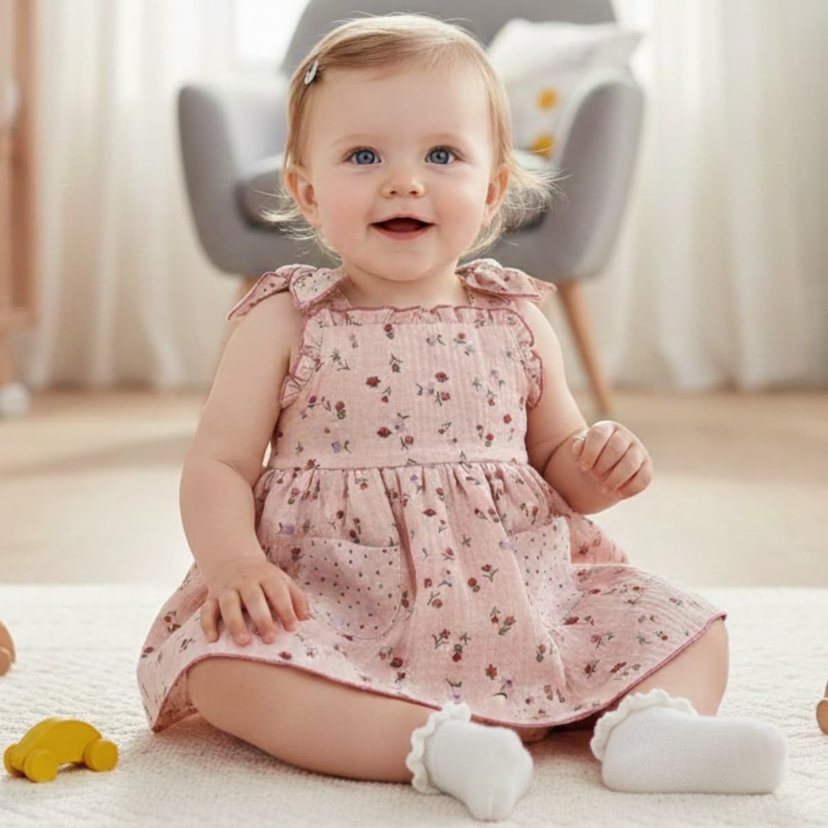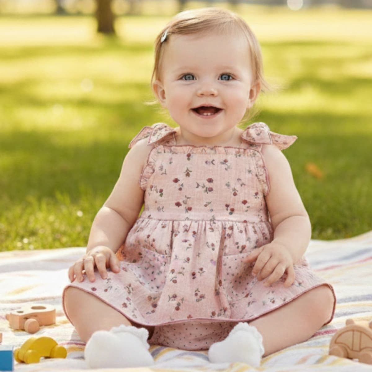 Se acompaña de braguita a juego, ideal para completar el look con armonía. Confeccionado en tejido ligero, fresco y transpirable, suave con la piel del bebé. Un conjunto ideal para paseos, celebraciones y looks veraniegos llenos de estilo.