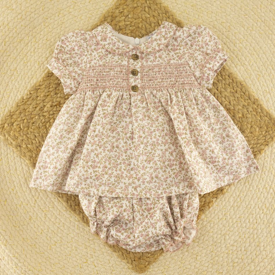 Dulzura y encanto se unen en este precioso conjunto para bebé niña, compuesto por una blusita de vuelo y una braguita a juego, confeccionadas en un suave tejido de algodón con un delicado estampado floral en tonos rosa empolvado y beige.