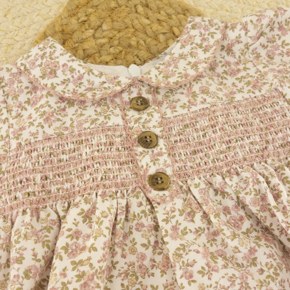 La parte superior destaca por su elegante bordado de nido de abeja en el pecho y sus botones decorativos de madera, que aportan un toque artesanal y clásico. Las mangas cortas abullonadas y el cuello redondeado completan un diseño lleno de ternura y comodidad.