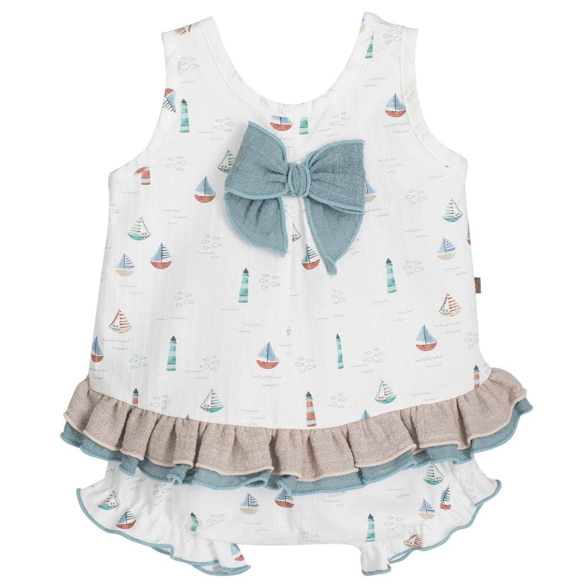 Jesusito de bebé con estampado marinero, compuesto por vestido sin mangas y pololo a juego.