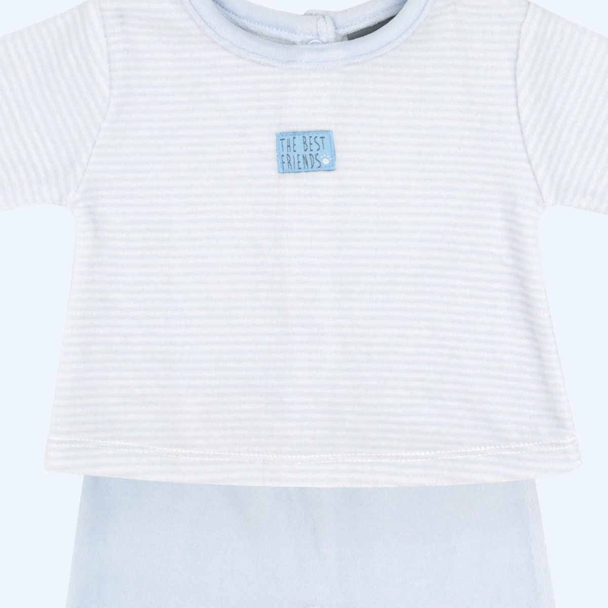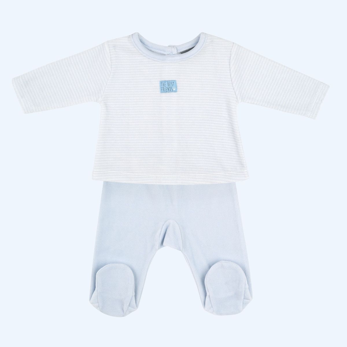 Dulce, suave y cómodo 🌙 Este conjunto de dos piezas para bebé niño es ideal para los primeros meses. Está compuesto por una camiseta de manga larga con finas rayas celestes y una polaina lisa con pies cerrados a juego.