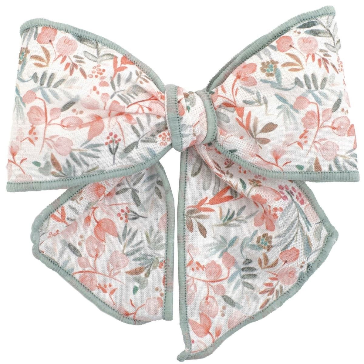 Delicado lazo para bebé confeccionado en estampado floral en tonos coral, verde agua y beige, rematado con fino ribete verde agua que realza su forma y le aporta un acabado elegante.
