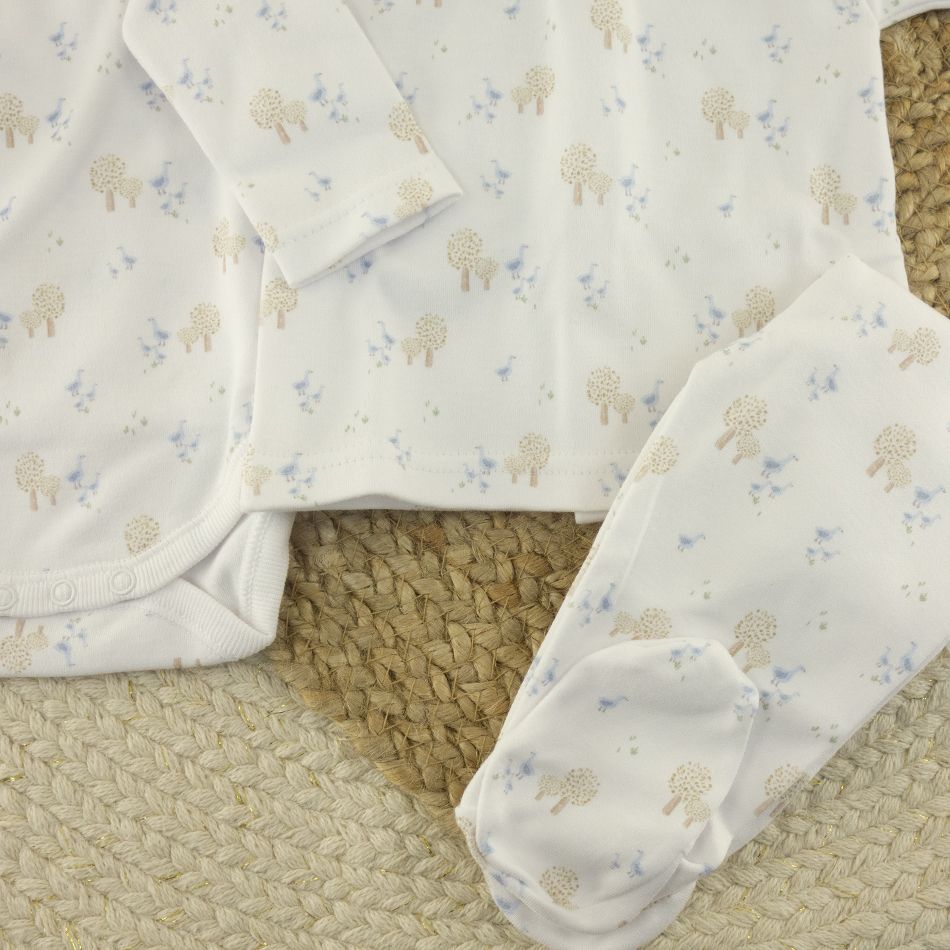 Con un dulce estampado de animalitos y ramitas en tonos beige y azul, combina comodidad y estilo en cada pieza.
