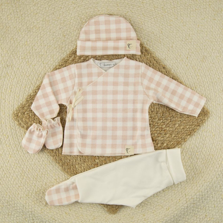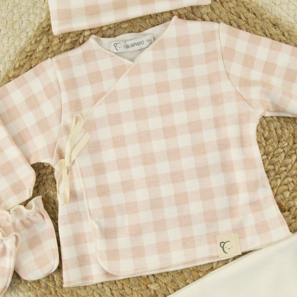 Confeccionado en suave algodón, ofrece el máximo confort y un diseño dulce y elegante en estampado de cuadros rosa y blanco.