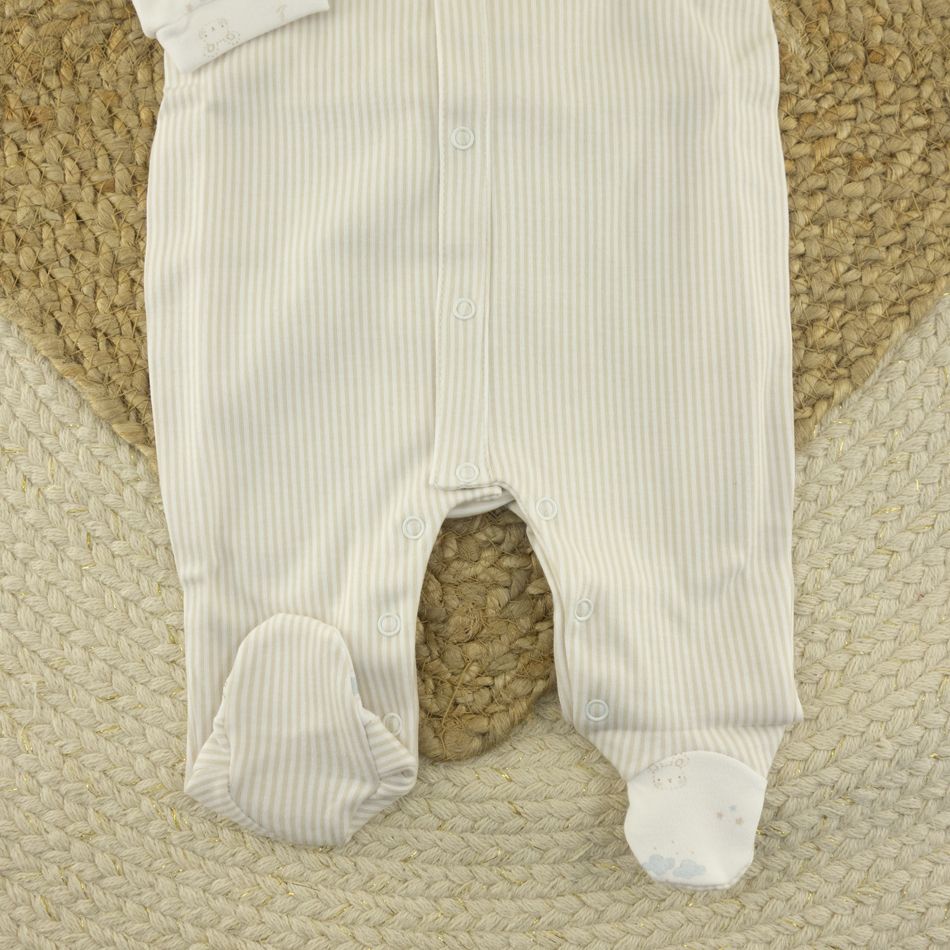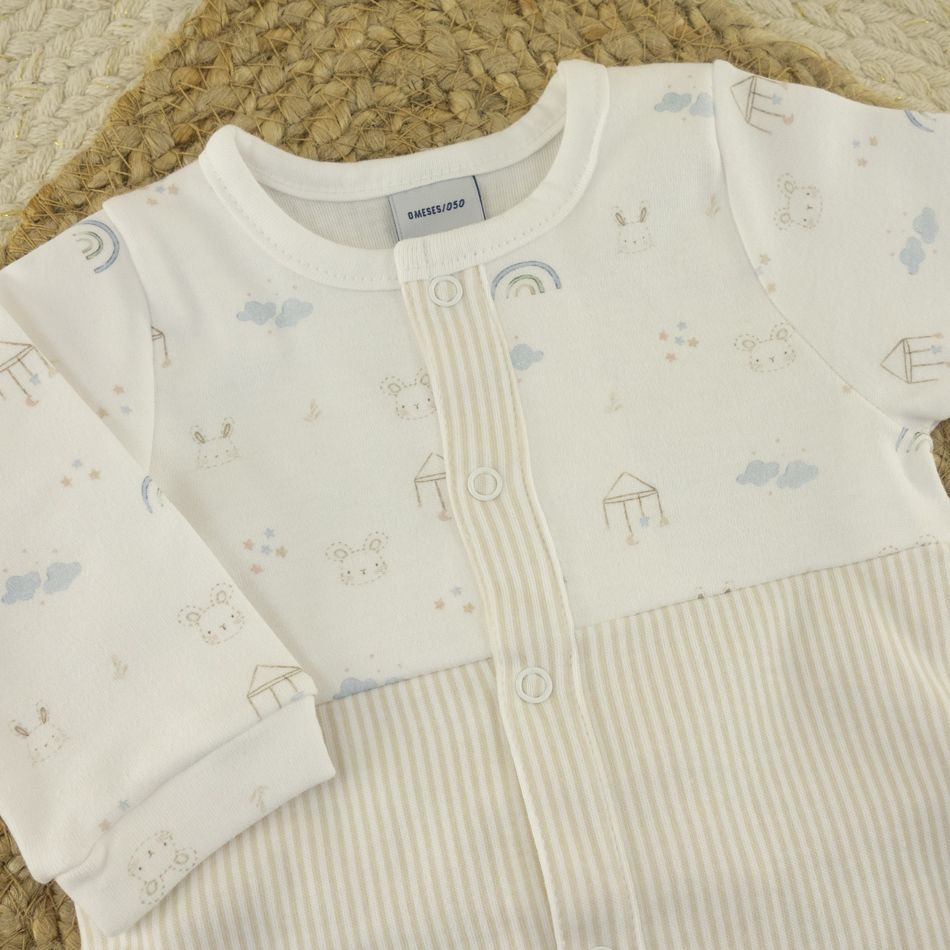 El diseño presenta un cuerpo superior con estampado infantil de arcoíris y nubes, y una parte inferior en tejido de rayas beige, creando un contraste elegante y tierno. Incluye corchetes delanteros y entre las piernas para facilitar el cambio de ropa y pañal.