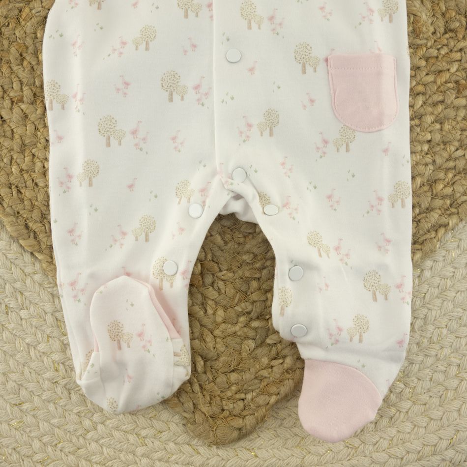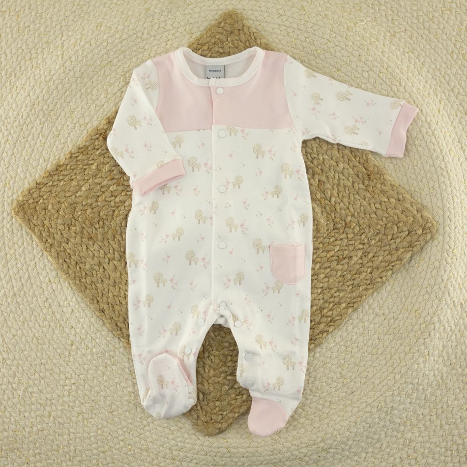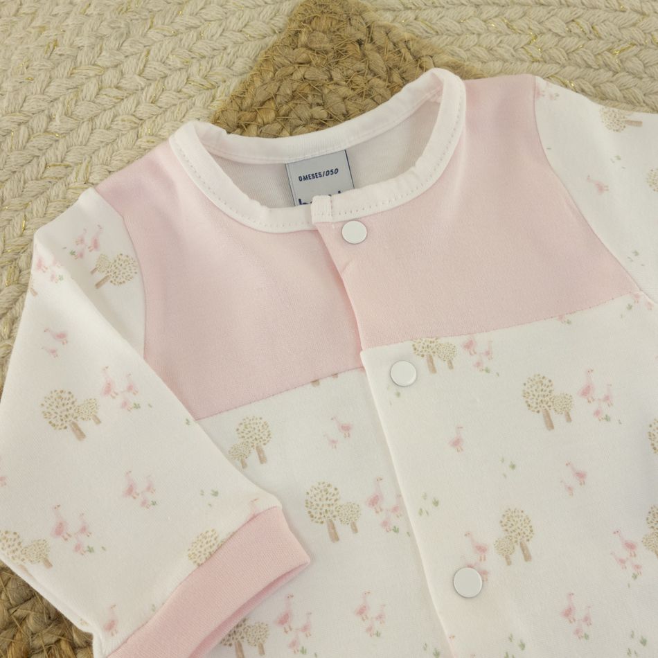 Dulzura y comodidad se unen en este precioso pijama enterizo de bebé con un delicado estampado de animalitos y arbolitos en tonos rosa pastel.