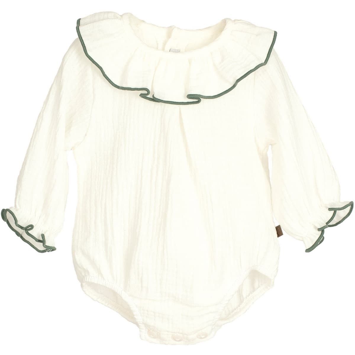 Este adorable pelele de muselina color crudo combina elegancia y comodidad en una prenda perfecta para el día a día o para ocasiones especiales.