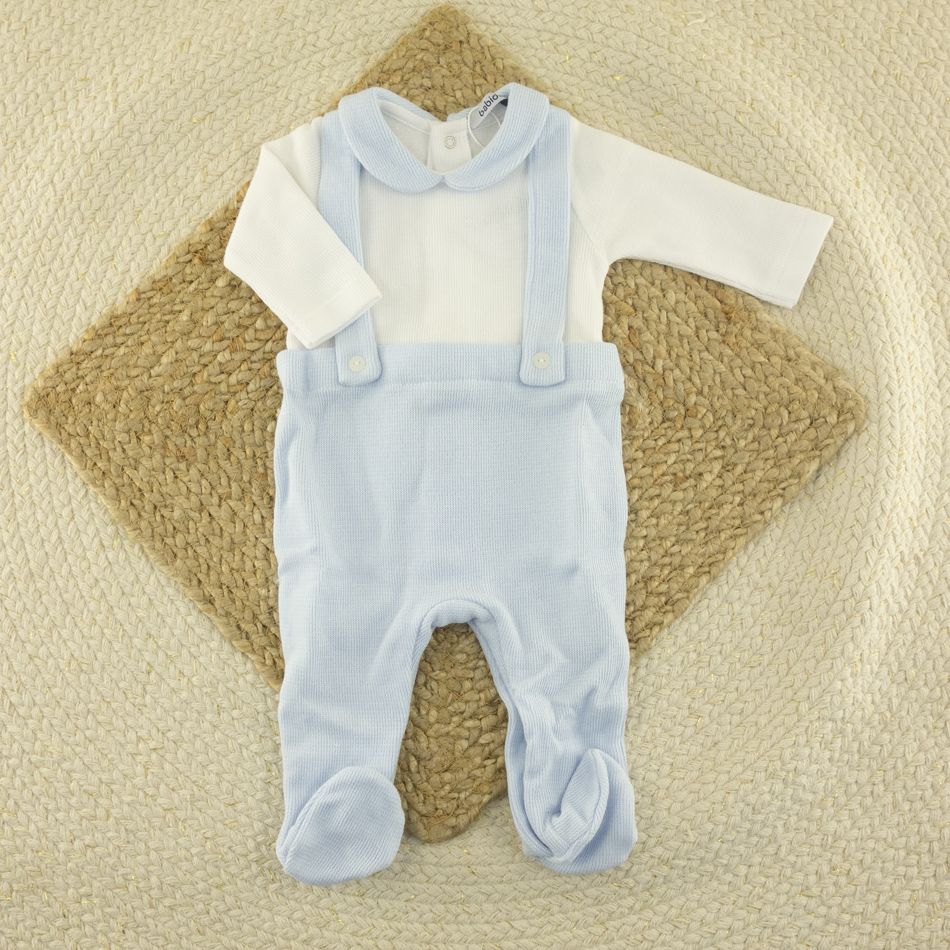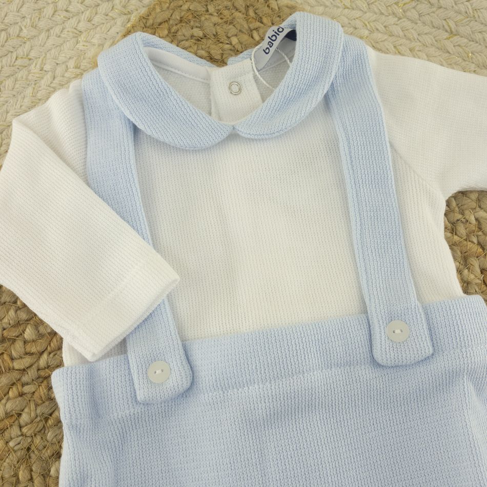 Tierno y elegante conjunto para bebé niño, compuesto por jersey blanco de manga larga y peto con pie en tejido punto color celeste, ideal para los meses más frescos del año.