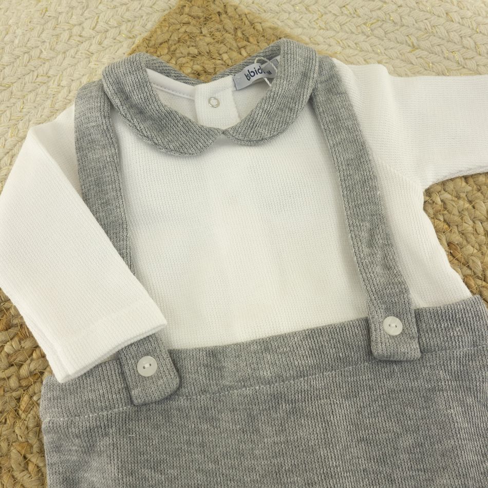 Tierno y elegante conjunto para bebé niño, compuesto por jersey blanco de manga larga y peto gris con tirantes, confeccionado en un suave tejido de punto ideal para los meses más frescos. Una prenda clásica y confortable, perfecta para mantener a tu peque abrigado y con estilo.