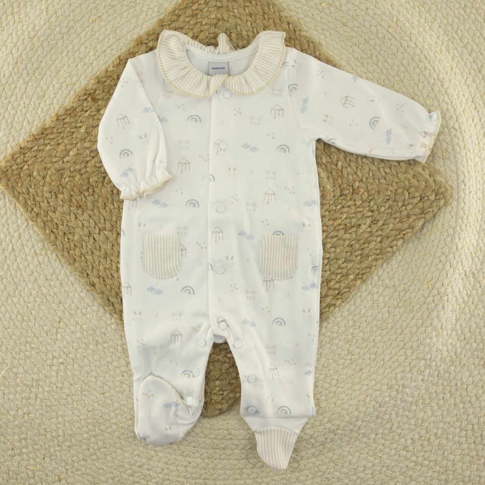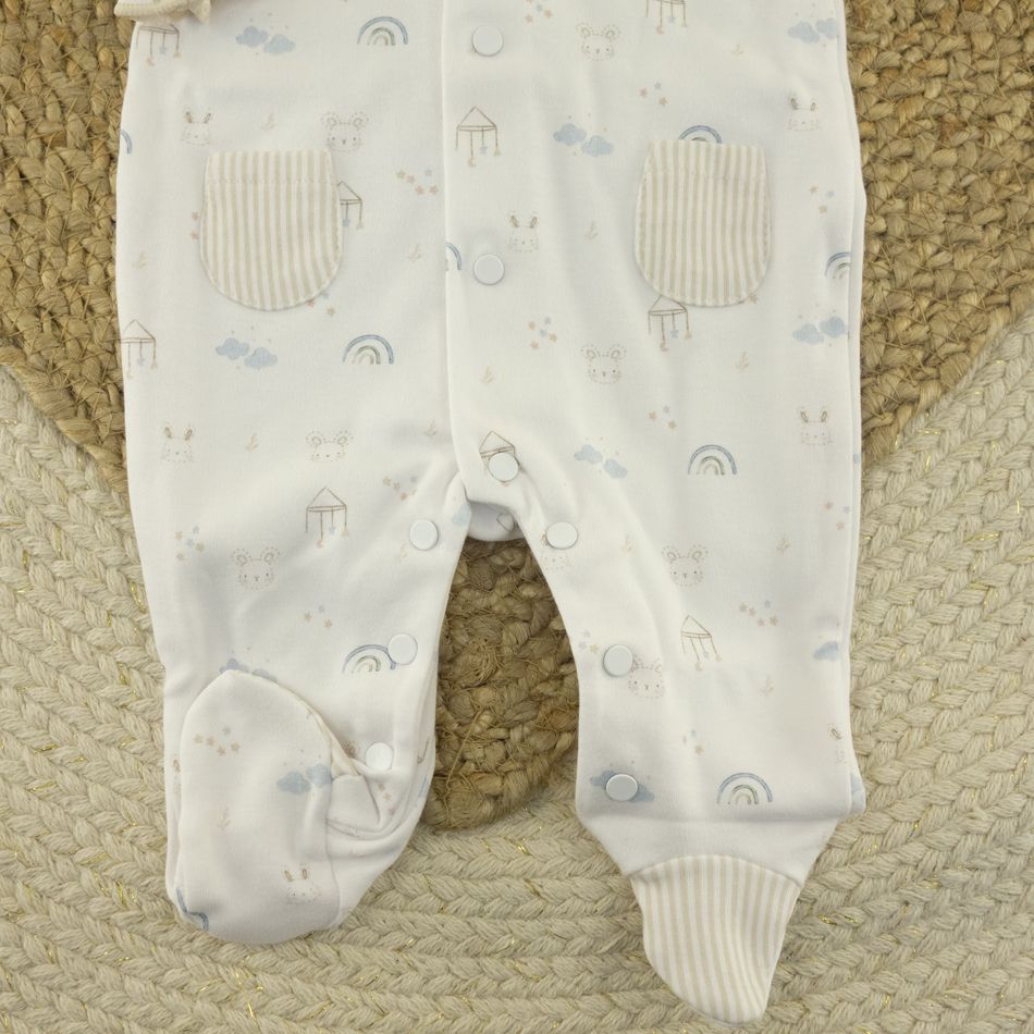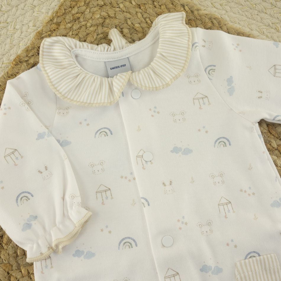 El diseño presenta un estampado infantil con arcoíris, nubes y casitas, junto con delicados detalles en tejido de rayas beige en el cuello, bolsillos y pies.