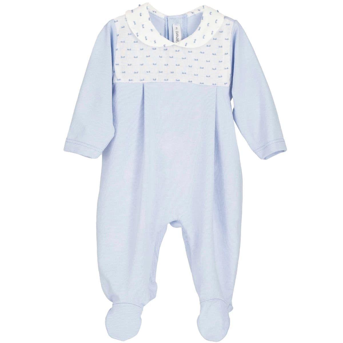 Presenta un delicado diseño con cuellito bebé y un panel superior texturizado de plumeti y un suave tejido que cubre hasta los pies.