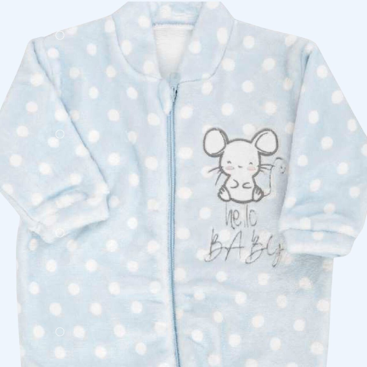 Presenta un diseño adorable con topitos blancos y un bordado de ratoncito acompañado del mensaje “Hello Baby”. Además, cuenta con cremallera frontal para facilitar el cambio de ropa o pañal, siendo una opción práctica y segura para el día a día.
